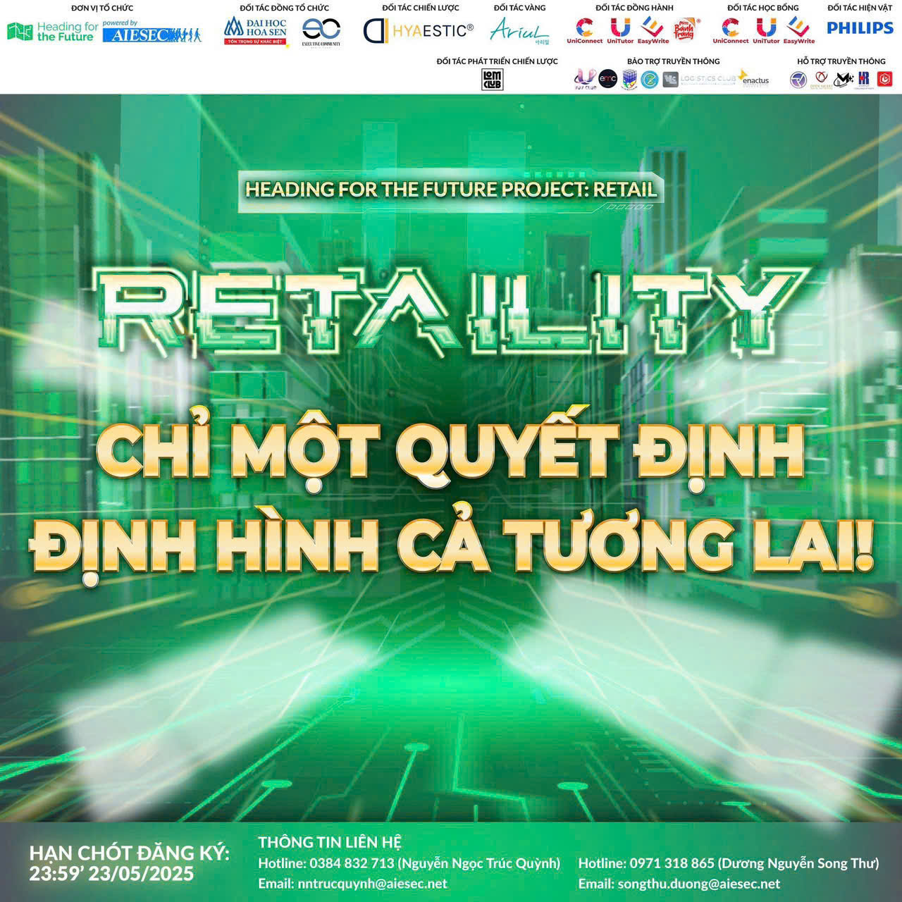 (Thành lập từ năm 1948, AIESEC là tổ chức thanh niên lớn nhất thế giới, có mặt ở hơn 108 quốc gia và 2000 trường đại học trên toàn cầu) Heading for the Future Project: Retail là dự án tiên phong giúp sinh viên xây dựng lợi thế cạnh tranh trong thị trường lao động bằng cách trang bị kiến thức chuyên môn và trải nghiệm thực tiễn trong ngành Bán lẻ. Thông qua các case study mô phỏng thực tế, giúp đỡ từ chuyên gia và cơ hội kết nối doanh nghiệp, dự án không chỉ giúp bạn hiểu ngành – giỏi nghề mà còn truyền cảm hứng, khơi dậy sự tự tin để chinh phục những thử thách thực tế. Kết hợp với Mô hình phát triển Kỹ năng Lãnh đạo của AIESEC, dự án còn là bệ phóng để bạn khám phá tiềm năng, phát triển kỹ năng toàn diện và sẵn sàng bứt phá trong sự nghiệp.